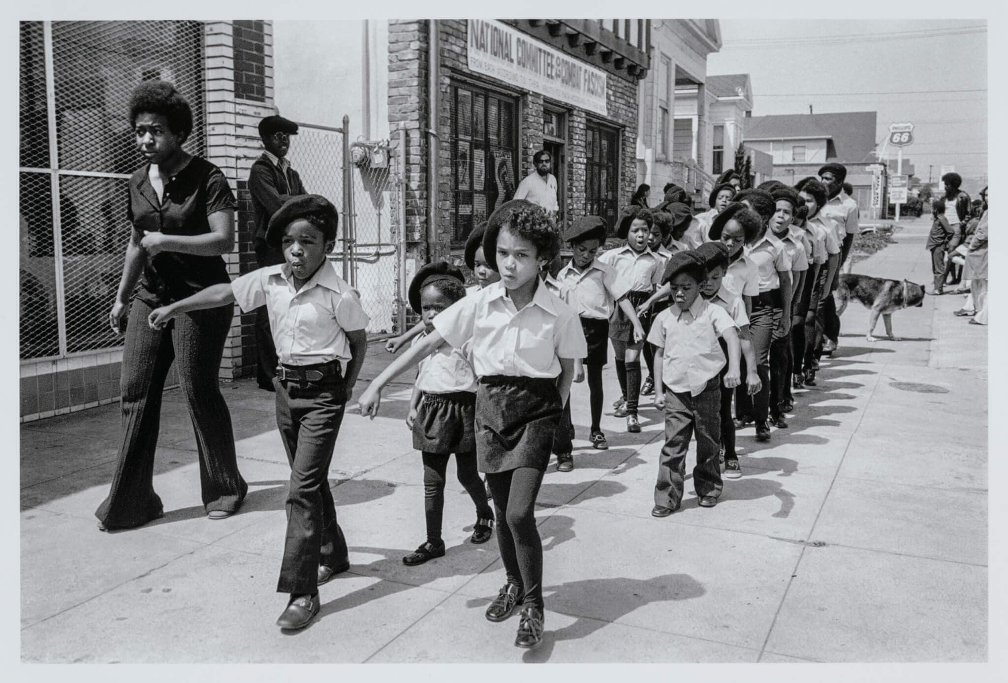 Stephen Shames, Berkeley, California: Sons and daughters of members of the Black Panther Party march in front of the Black Panther office on Shattuck Avenue., 1971. Archival pigment print. Gift of Lizbeth and George Krupp. Courtesy Museum of Fine Arts, Boston.
