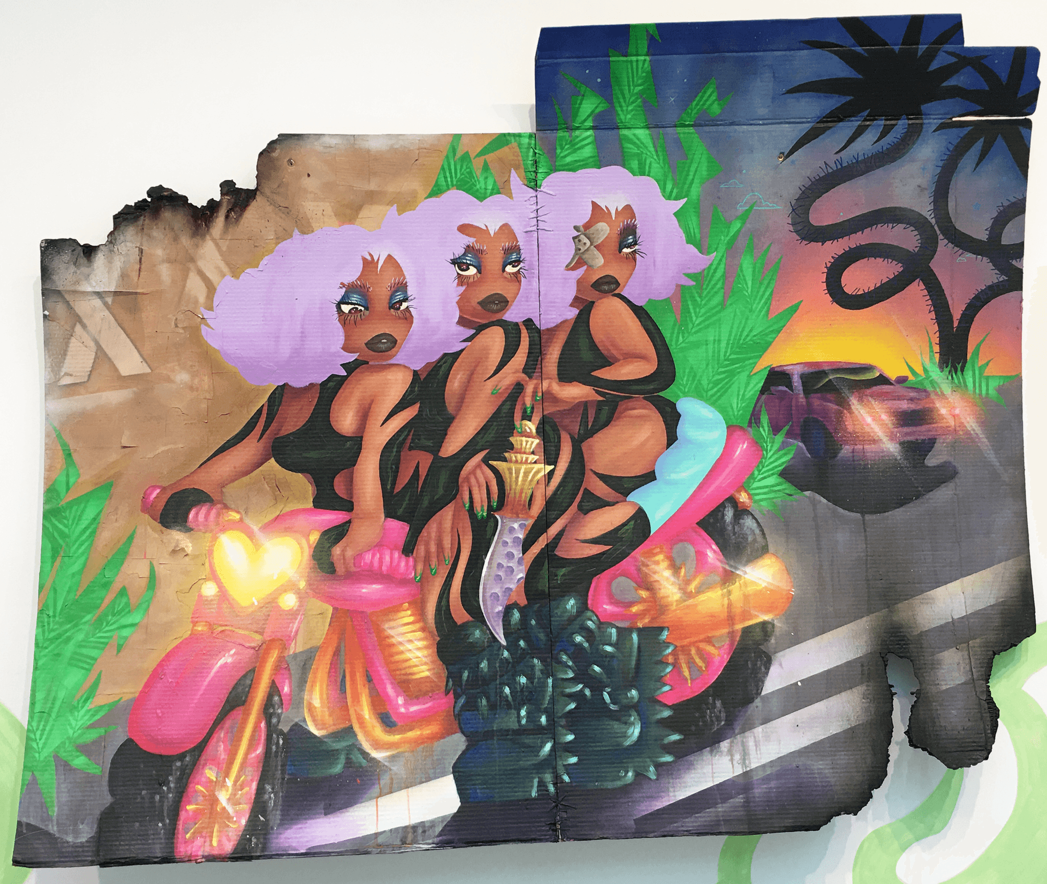 Rixy, Now What Kind of Knucklehead Told Y’all To Go This Way?, 2022. Paper, spray paint, acrylic, ink, marker, thread, and fire on treated cardboards, with paracord. Courtesy of Trustman Art Gallery.
