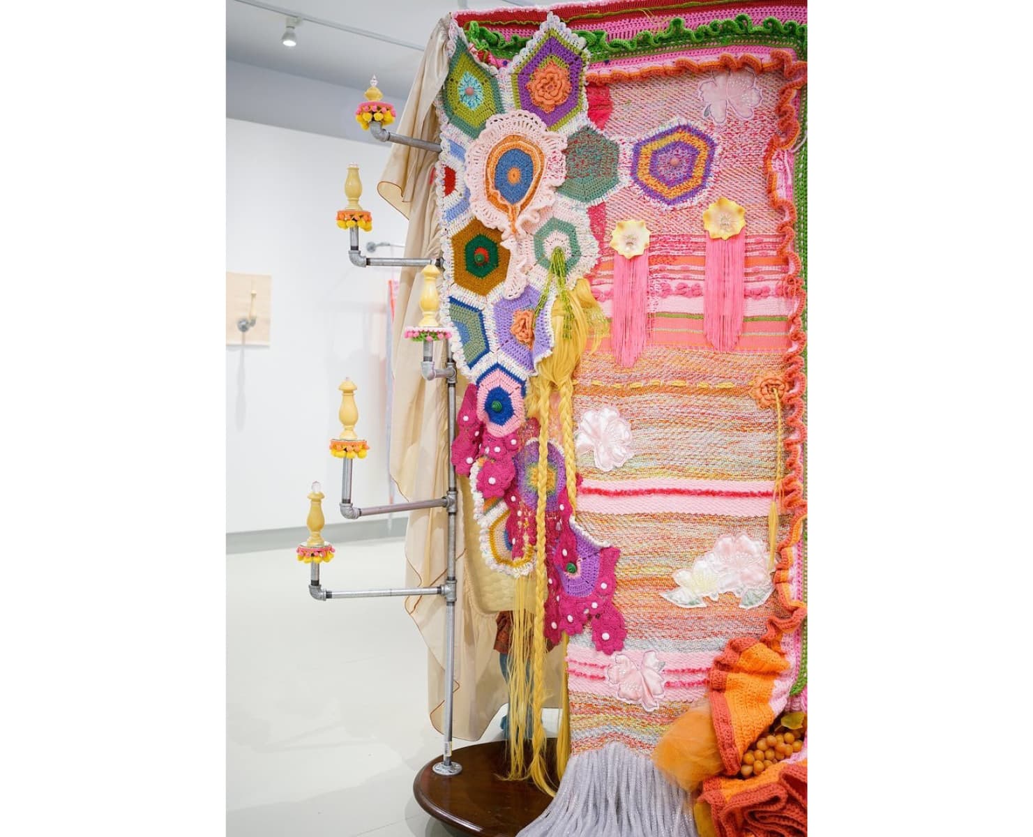 Samantha Fields, Diamonds & Grapes, 2022. Hand-woven cloth, crochet, beading, embroidery, yokes, tri beads, synthetic hair, grapes, pipe fittings/nipples, table legs and finials cast in vitreous china, repurposed bed spread, afghan, and table. 83″ × 66″ × 38″. Image courtesy of LaMontagne Gallery.