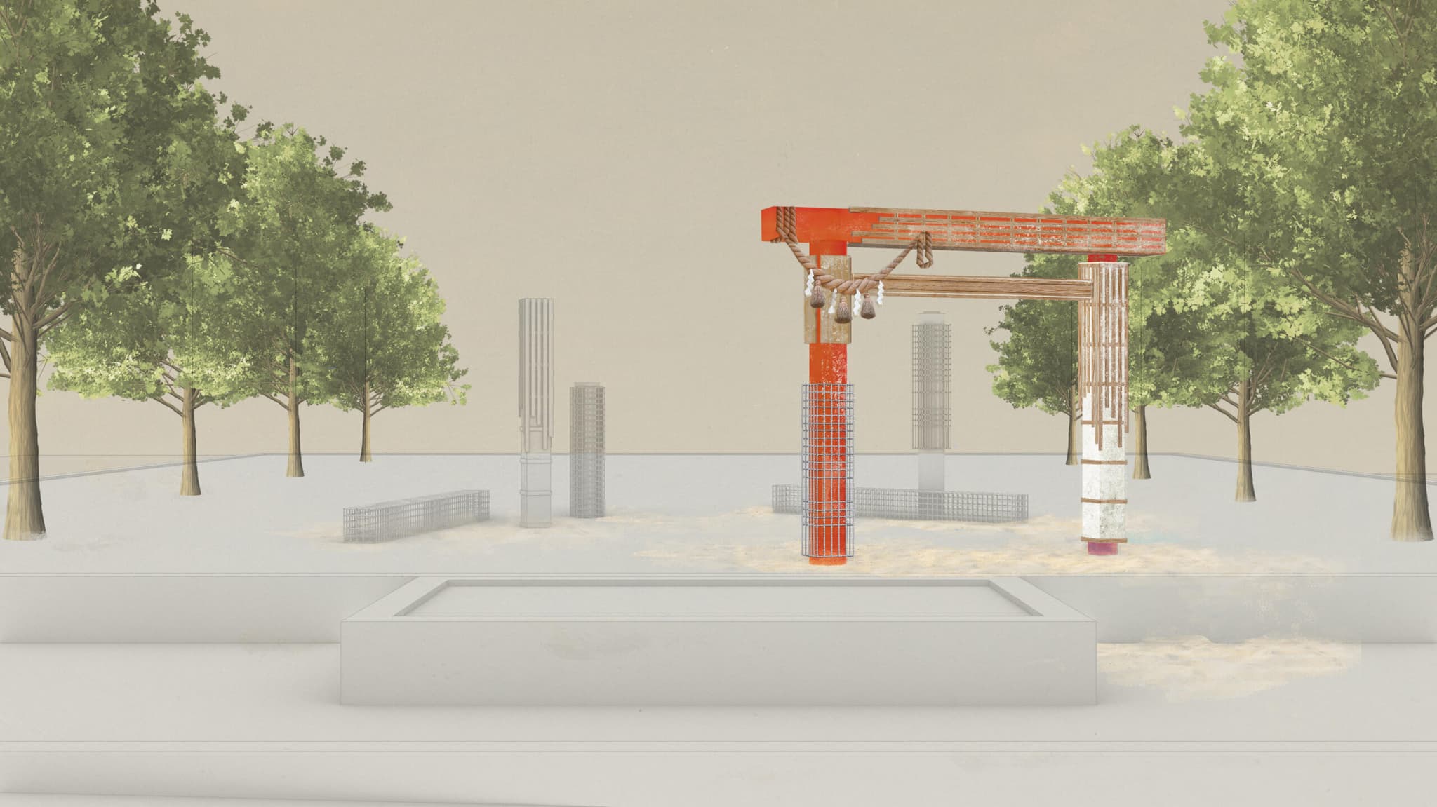 Early perspective rendering of Torii by Matthew Okazaki for Boston Public Art Triennial’s Lot Lab. Courtesy of the artist.