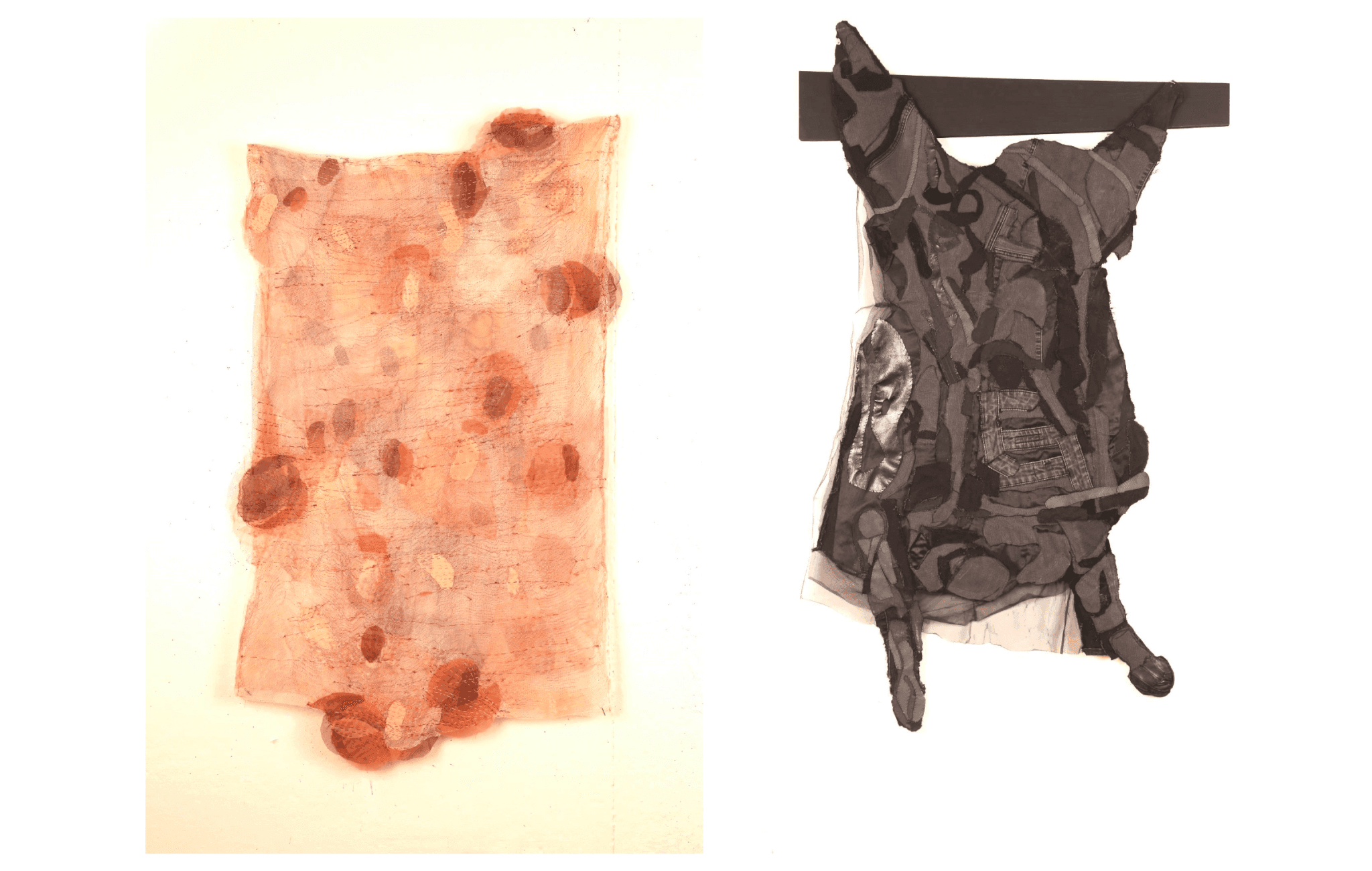 (left) Françoise McAree, Subcutaneous, 2023. Cheesecloth, hand-painted fabric, thread, 22″ x 29″ x 2″. (right) Françoise McAree, Rembrandt Carcass, 2022. Hand-sewn textile, thread, wood, rope, paint, 28″ x 55″.