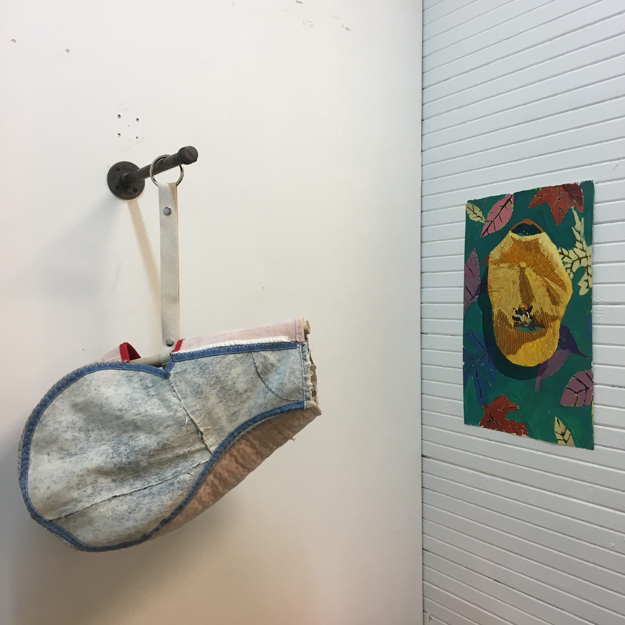 Image of one of the walls in the gallery with three paintings hung on the left and four clothing items hung on the right. Foregrounded on the floor is a basketball made out of cloth.