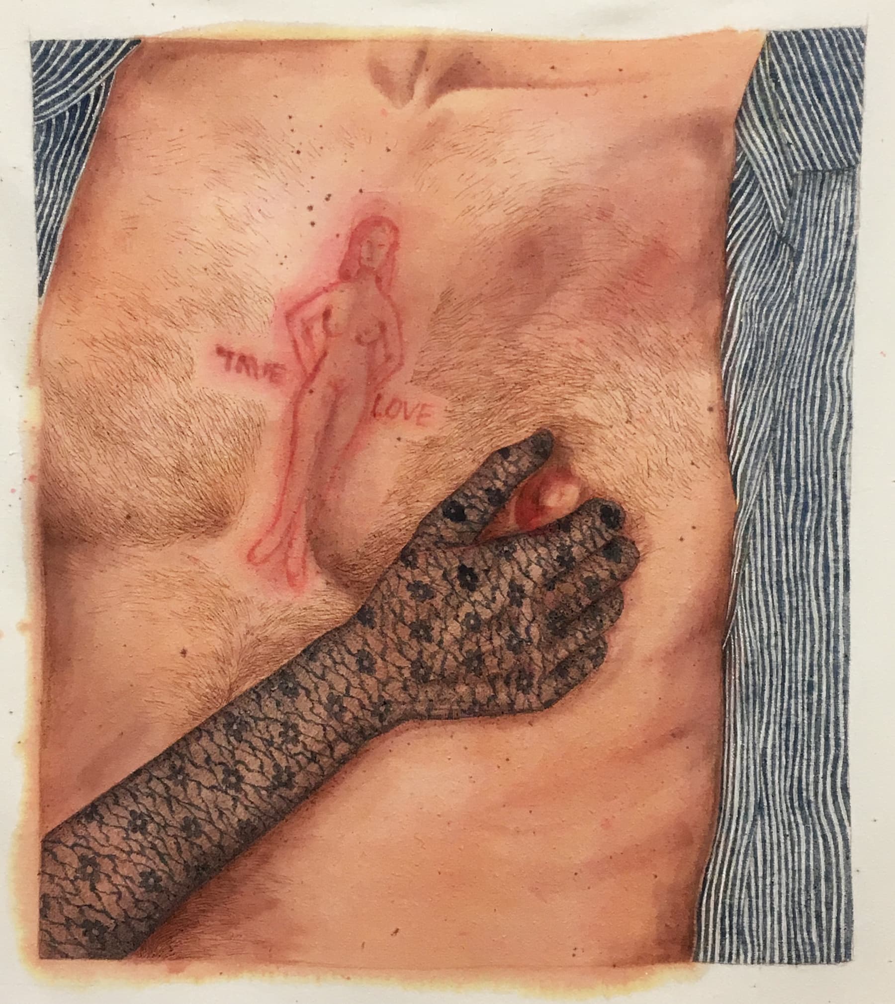 Artist Katarina Riesing presents works in several media, most prominently displaying a rack of clothing with hand-embroidered stitching of various body parts onto coats, shirts, and scarves. The rack is inviting, demanding the direct engagement of the audience as one works through the rack of reworked garments. Her stitched hands, often with severed fingers and playful drops of blood, dominate both a simple cotton stretch bodysuit and a reworked denim smock dress, foreboding the fate of anyone audacious enough to touch the individual wearing  the garment. The artist also works with silk scarves and dyes them with neutral tones. The delicate silk prints portray various perspectives of the female and male body, with both male and female genitalia being explicitly or implicitly displayed for the viewer to connect with. The overarching feeling of the silks is one of female dominance and control, as a lace-ensconced hand wrings a male nipple with the words “TRUE LOVE” etched into his chest with a razor. Here, in Riesing’s world, female pleasure is derived entirely from female agency and operates to subvert the notion of female objectivity and passivity. The simplistic clothing bring the female body to the forefront and suggest femininity and eroticism without the traditional notions of sexual pleasure as determined by unrealistic images that are typically forced upon women.