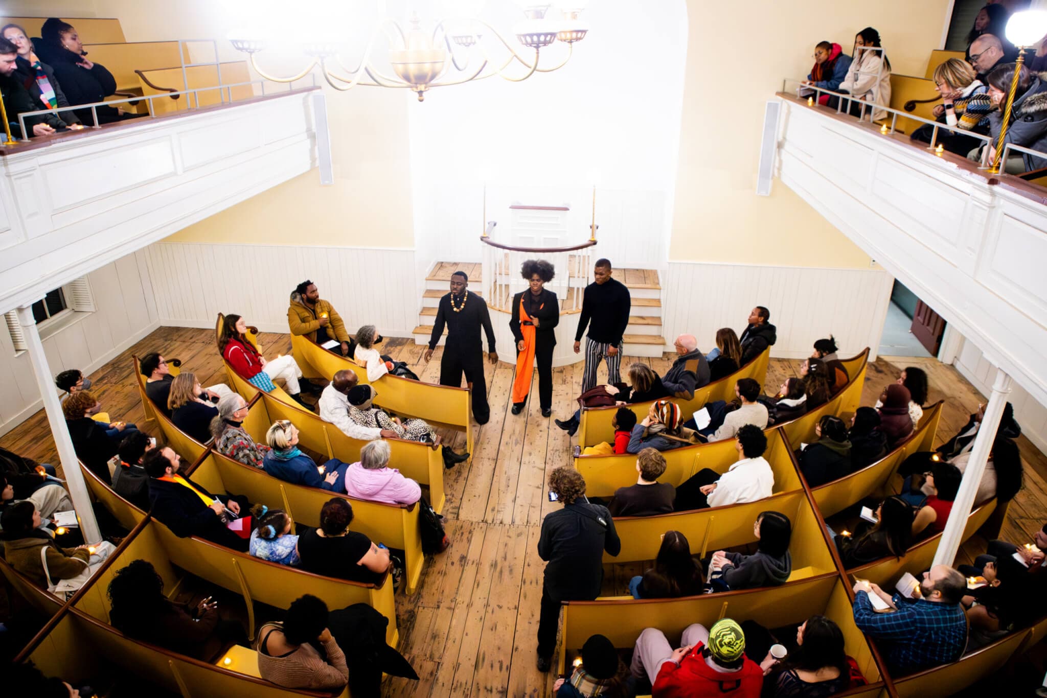 From its inception in 1806, the African Meeting House was the center of Black Bostonian life: It served as the African Baptist Church and housed cultural registers from day-to-day working to organizing and educating. The discussions held and sermons delivered within the building disseminated Black thought on abolition. The sound of the voices of brave, determined abolitionists carried through its interior without end. The building now operates as part of the Museum of African American History (MAAH) and on February 28, artist Jonathan González’s suite for a minor meeting, a site-specific performance and sonic work, brought its architecture to life. The performance was commissioned by MAAH to accompany the artist’s print series by the same name, now on view in “Magical Thinking, of Systems and Beliefs” at Tufts University Art Galleries (TUAG).