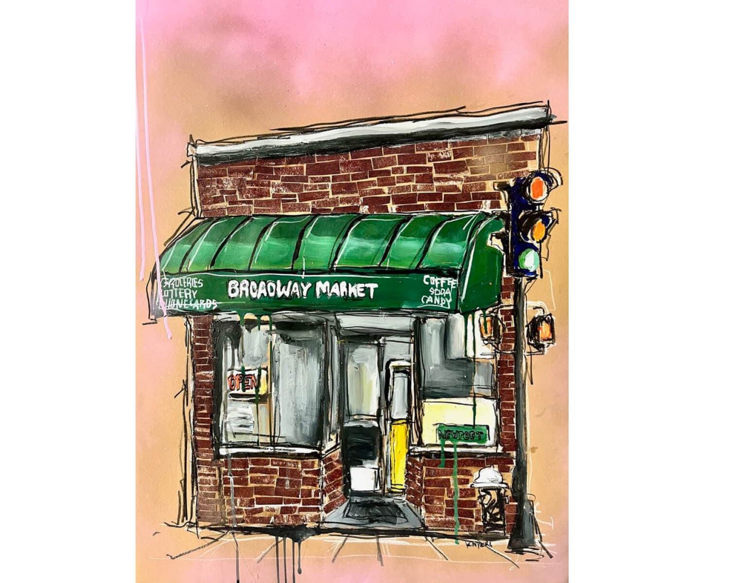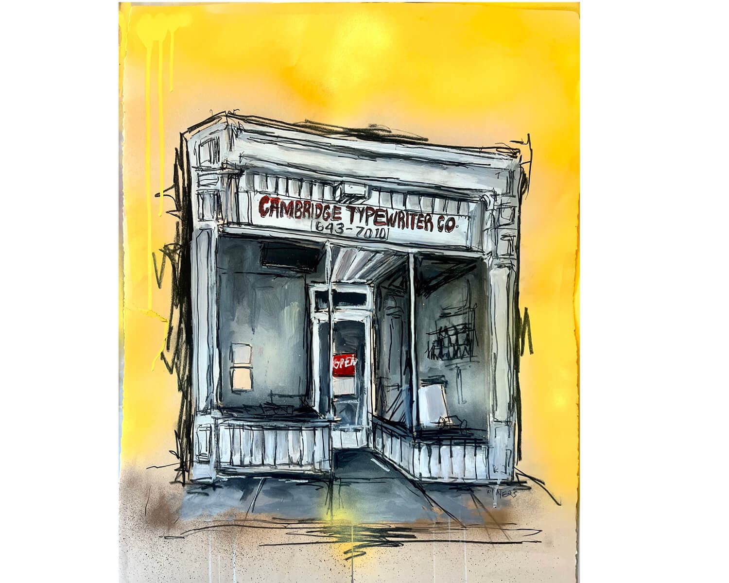 Boston-based artist Kayla Myers often creates expressive mixed-media homages to small businesses that serve their neighborhoods, preserve the culture of their communities, and increasingly face risk of displacement—mom-and-pop restaurants, hair-braiding salons, the corner market open seven days a week. For this project, she embarked on extensive research before selecting the bygone Brigham’s ice cream shop, the Broadway Market convenience store, D’Agostino’s deli, the Capitol Theatre, the Book Rack used bookstore, and the Cambridge Typewriter Co. repair shop. Myers initially learned of the last on that list from a May article in the Globe, which described longtime proprietor Tom Furrier’s decision to retire after forty-four years and his hope to find someone to carry on the business. The actual storefront is tucked on Mass Ave between a house and a chiropractor’s office, but Myers, working with a limited but potent palette of black, white, red, and yellow, depicts the shop standing alone, telegraphing that it’s the last of its kind. Though the sign on the door says “Open,” the interior is shadowy, largely vacant; we can’t see the marvels of machinery that, with expert care, keep working decade after decade, so unlike the laptops often tossed in landfills after five years of use. The dark lines Myers uses to render the millwork make the white exterior look worse for wear, but the background shines in shades from lemon yellow to saffron, lending undeniable warmth to the scene. Depth and texture accrue in acrylic, charcoal, pastel, and spray paint, which drips down one side like a squeeze of sunshine. The grunge heightens the glow in a way that feels tender and fitting for a place that hosted marriage proposals, a place that seemed like a wonderland for many local writers, whose names you could spy on cards by their waiting Royals and Underwoods. A similar warmth suffuses her painting of the Book Rack, lit up with sunset colors as paint dribbles down like melting vanilla, chocolate, and strawberry ice cream. This, Myers seems to say, is a place of pleasure and delight.