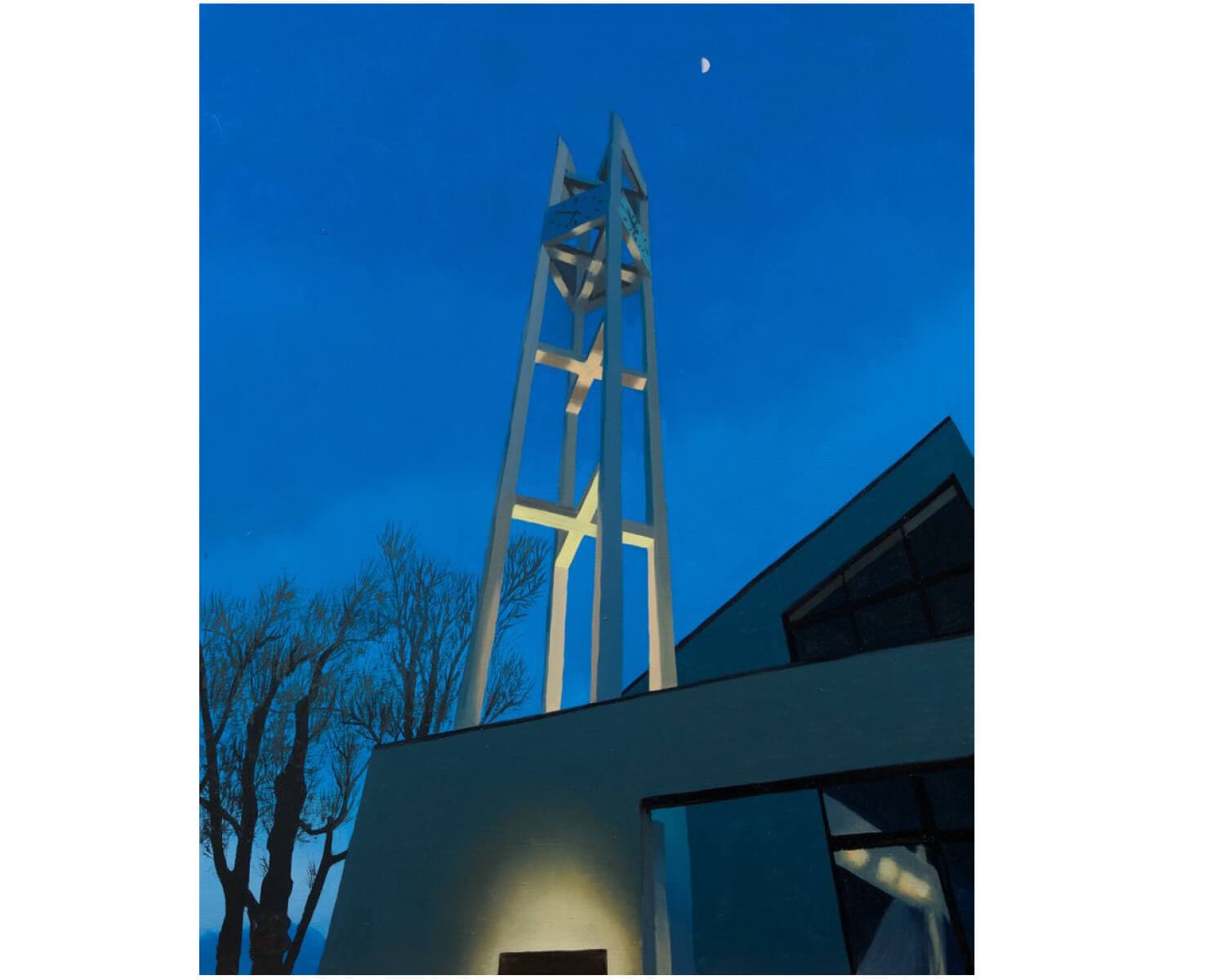 Paul Beckingham, First Parish Tower, 2024. Oil on aluminum. Photo courtesy of the artist and 13FOREST Gallery.