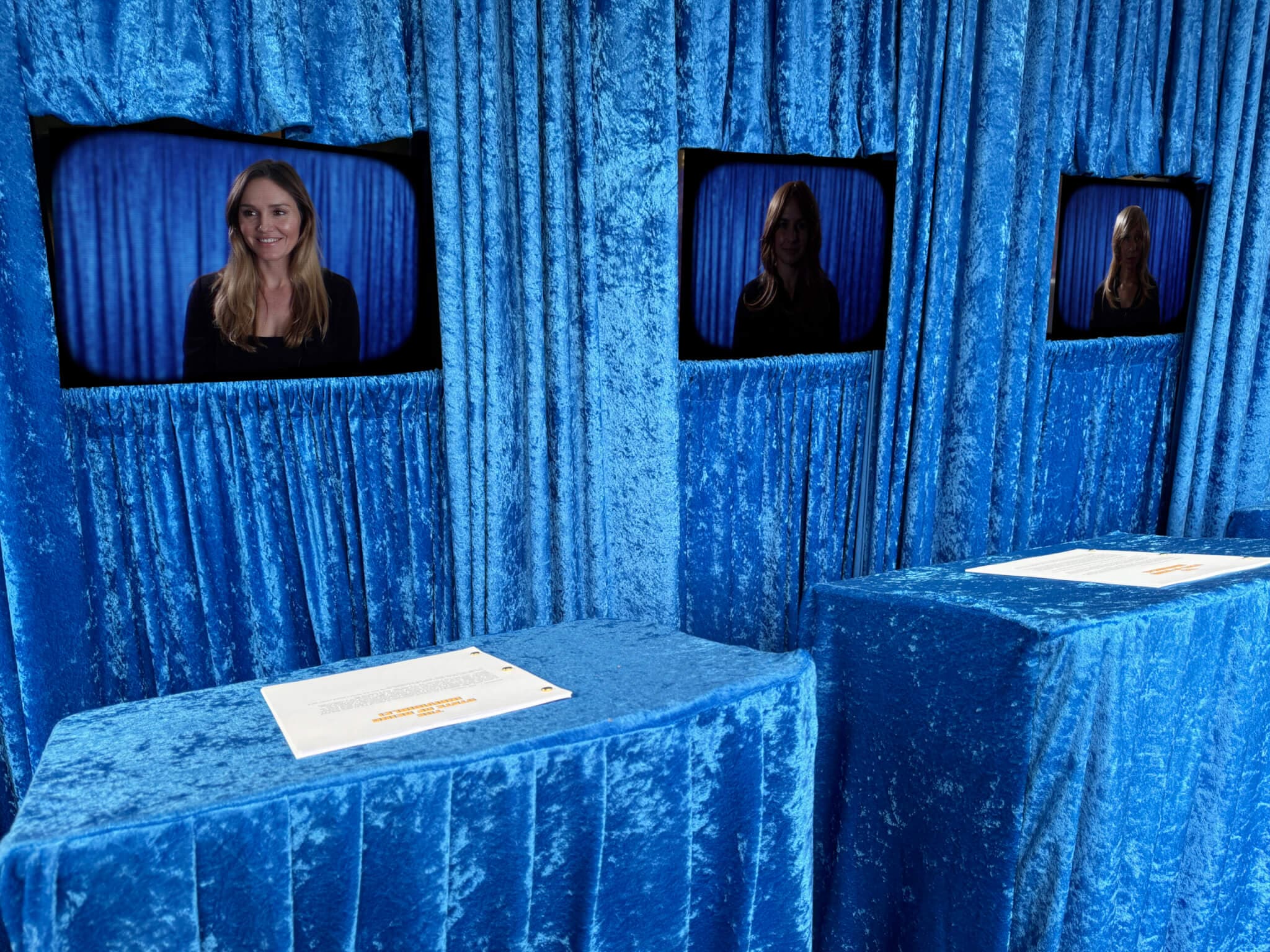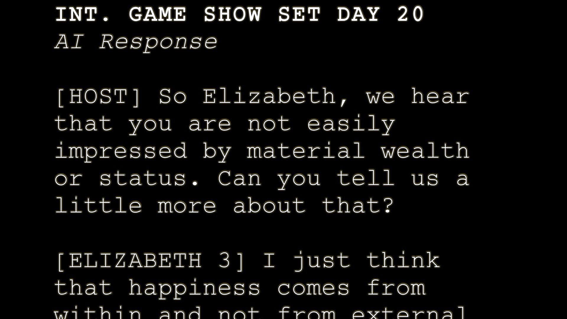 Withstandley tests this concept on herself with an accompanying three-channel video that plays on screens enclosed in a blue velvet curtain. The artist uses ChatGPT to recreate her own version of the “contestant chat,” complete with three podiums for the three versions of herself. To create three distinct versions (representing what she calls a “private life, a public life, and a fictional life”), Withstandley produced forty-one facts she wrote about herself, accompanied by forty-one facts collected from family and friends, and an AI-generated set of forty-one facts. She then prompted ChatGPT to create a script from these sets of facts that would emulate the cadence of the original Jeopardy! format. A final edited composite script is read by each Elizabeth in conversation with an AI-voiced host.