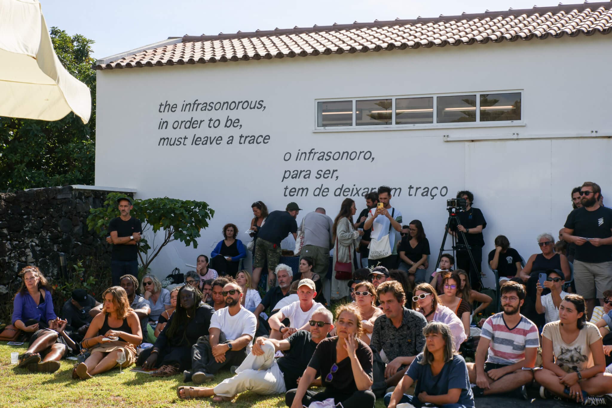 Attendees gather for the opening of the 2025 Walk&Talk Biennial, Gestures of Abundance: Centro Cultural da Caloura. Writing on the side of the building is part of Lucy Bleach’s An Infrasonours archipelago, 2025. Photo by Mariana Lopes. Courtesy of Jesse James.