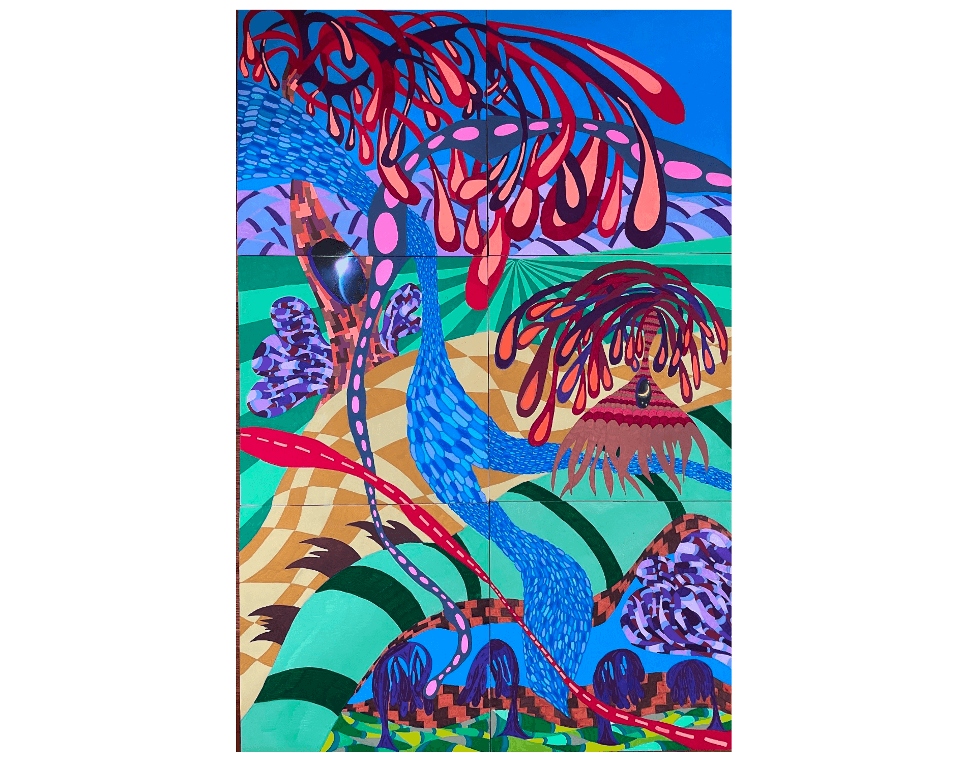 At her first major solo exhibition in New England, North Carolina-born and Cambridge-based artist Karmimadeebora McMillan presents a multimedia installation of animation, painting, and sound. Pulling from her childhood in the South, McMillan takes historical objects that depict Blackness and Black bodies with racist intent and bends them into freer, more possible realms, imbued with her own feeling and interpretation of the archive. Among other characters, a vintage doll-girl is a central figure in and of the speculative and many-hued landscape paintings McMillan creates. McMillan has reimagined this Black caricature as “Ms. Merri Mack,” deriving her name from a nursery rhyme that enslaved children may have sung on southern plantations about a Union ship during the civil war. In this show, Ms. Merri Mack and McMillan herself become a vessel, and a universe, of revised memory and futurity—always moving toward the threshold of other worlds. —Niara Simone Hightower